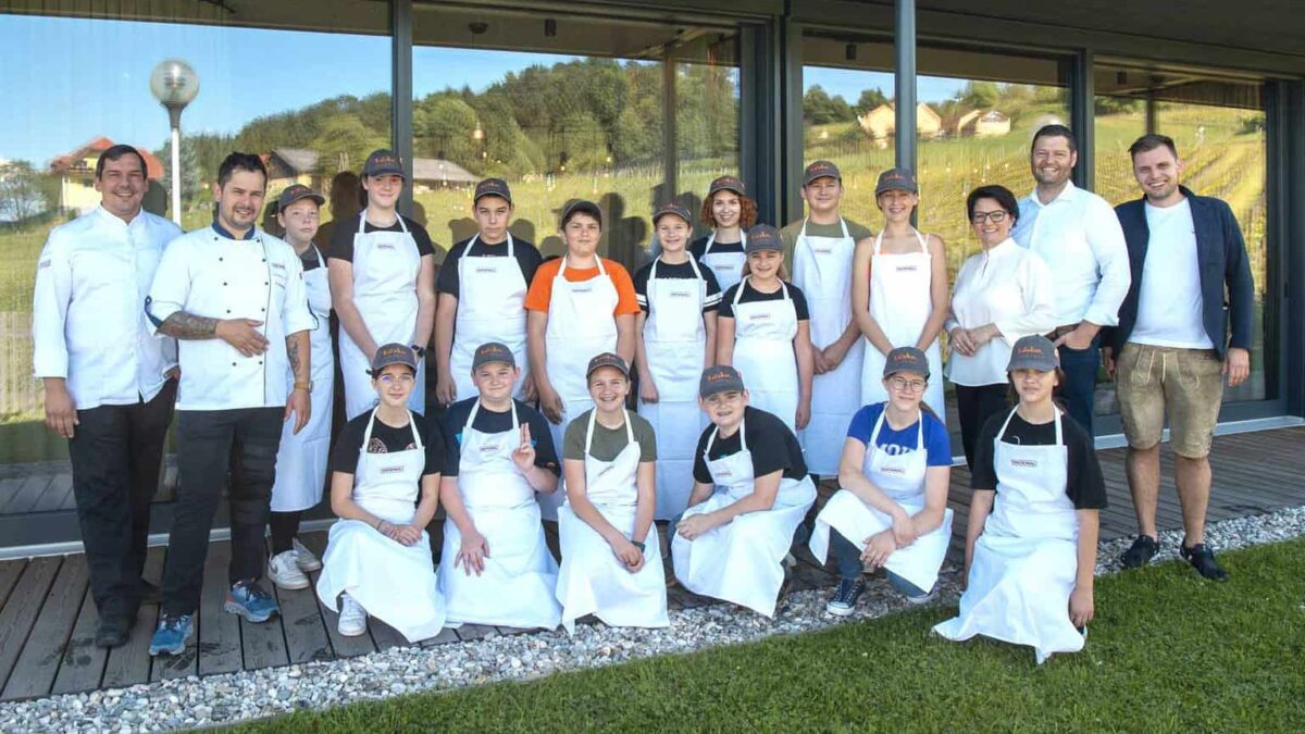 Die 2. Klasse der Mittelschule in Gamlitz war im Ratscher Landhaus zu einem Gastrotag eingeladen. Dabei erlebten die Schüler:innen die Gastronomie gemeinsam live vor Ort in der neuen Profiküche. Nach einem Hotelrundgang, einem Besuch im Kräutergarten mit Sammeln der Küchenkräuter und anschließendem Kochen eines 3-Gänge-Menüs waren die Kinder vollauf begeistert. Sie kochten gemeinsam mit Michaela Muster, der Chefin des Hauses, die ihre Leidenschaft in der Patisserie und im Service weitergab. Thomas Ranninger, Küchenmeister und Chef von Ranningers am Grottenhof begeisterte die Schüler:innen mit seiner langjährigen Erfahrung auf internationalem Parkett. Patrick Grassmugg von der Firma Rational zeigte, dass nicht nur in Töpfen und Pfannen gekocht wird, sondern dass mit den richtigen Geräten und deren Programmierung viel mehr möglich ist. Digitalisierung versus Kochkunst – kein Kontrast, sondern eine perfekte Symbiose.
