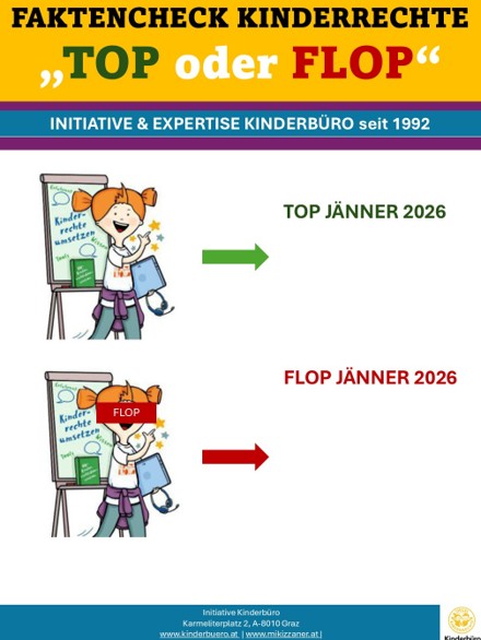 Mit dem Format FAKTENCHECK KINDERRECHTE – „TOP oder FLOP“ überprüft das Kinderbüro regelmäßig und spontan gesellschaftlich relevante Entwicklungen auf ihre Kinderrechtskonformität. Ob Gesetze, politische Entscheidungen, Projekte, Produkte oder öffentliche Maßnahmen – wir analysieren, ob diese dem Kindeswohl dienen, zur Förderung einer kinder- und familienfreundlichen Gesellschaft beitragen und den Prinzipien der UN-Kinderrechtskonvention gerecht werden.